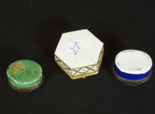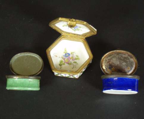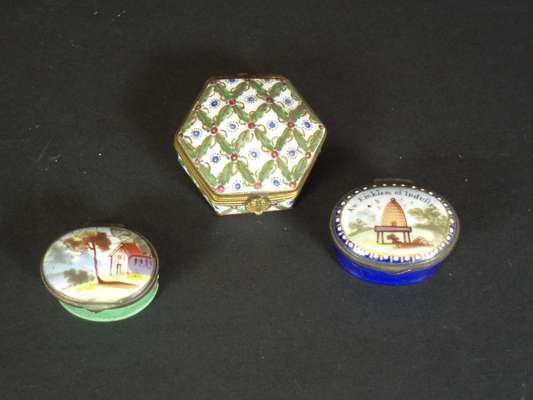 of oval form decorated with a beehive mark and inscribed 'An Emblem of Industry', 4cm wide; an enamel box of oval form decorated with a house and trees, 4cm wide; and a Sèvres style porcelain box of hexagonal form with overglaze decoration, blue painted marks to base, 5cm wide (3)