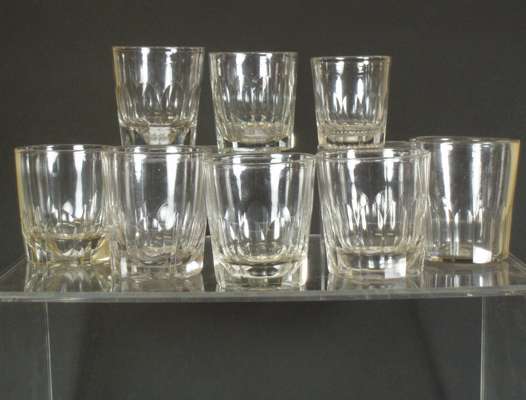 comprising: eight flute cut base spirit tumblers and eight plain spirit tumblers of various sizes; a large plain knop stem rummer, circa 1810; and a pair of flute cut bowl knop stem rummers, circa 1810 (19)