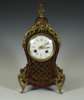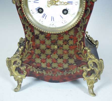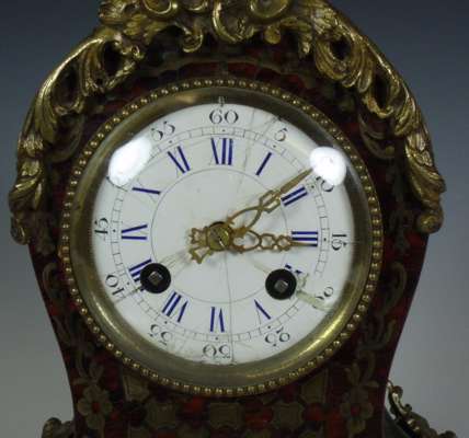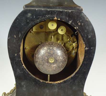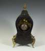the white enamel dial with blue Roman numerals and black Arabic numerals, the movement striking on a bell, the case of serpentine form with gilt metal mounts