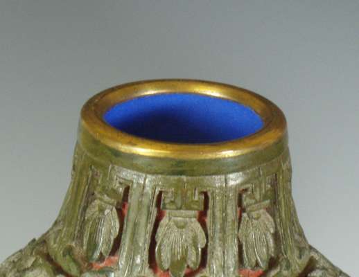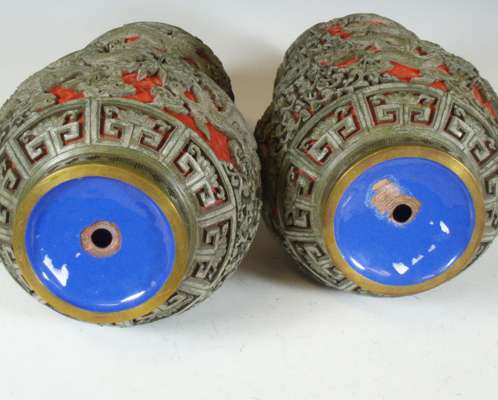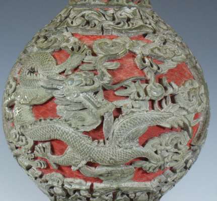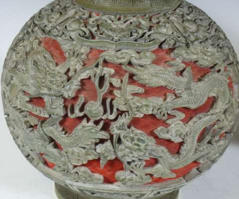 each with carved exterior depicting dragons chasing pearls of wisdom over a carved cinnabar lacquer ground (drilled) ALTERATION: MAY BE RESIN RATHER THAN WOOD, AS PER CATALOGUE