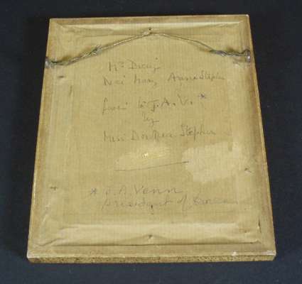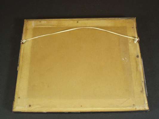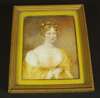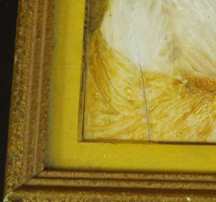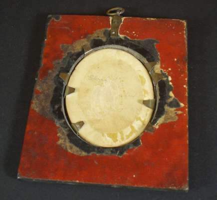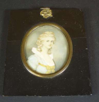 watercolour, in a gilt and ebonised frame, 8cm x 6cm; a rectangular portrait miniature of a lady, watercolour on ivory (cracked) in a giltwood frame, 11cm x 8.5cm; and a verre églomisé silhouette of a gentleman and a lady taking their tea in an interior setting, in an ebonised and gilt frame, 18cm x 23cm (3)