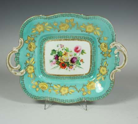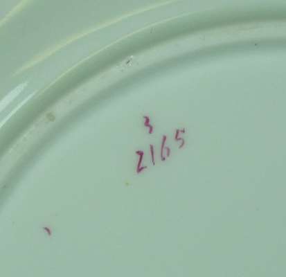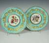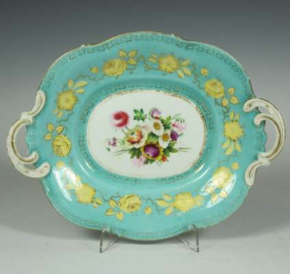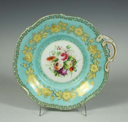 each item with painted bouquet surrounded by a turquoise band with gilt floral decoration, painted mark '2165', comprising: twenty plates and three comports (23)