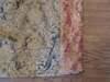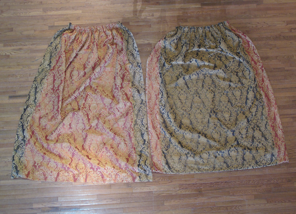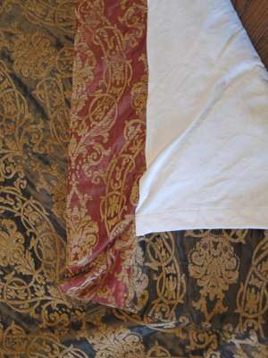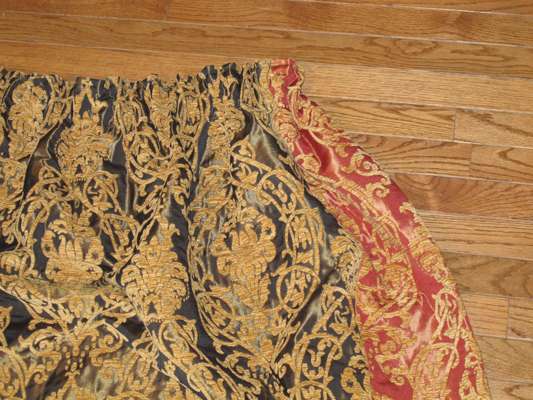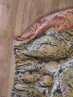 Three pairs of handmade red, gold and blue foliate pattern curtains