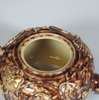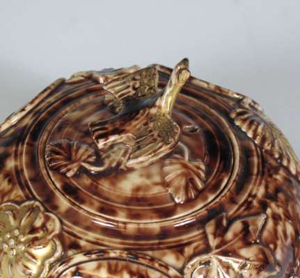 the cover with bird finial, the pot decorated with floral and foliate motifs standing on three feet