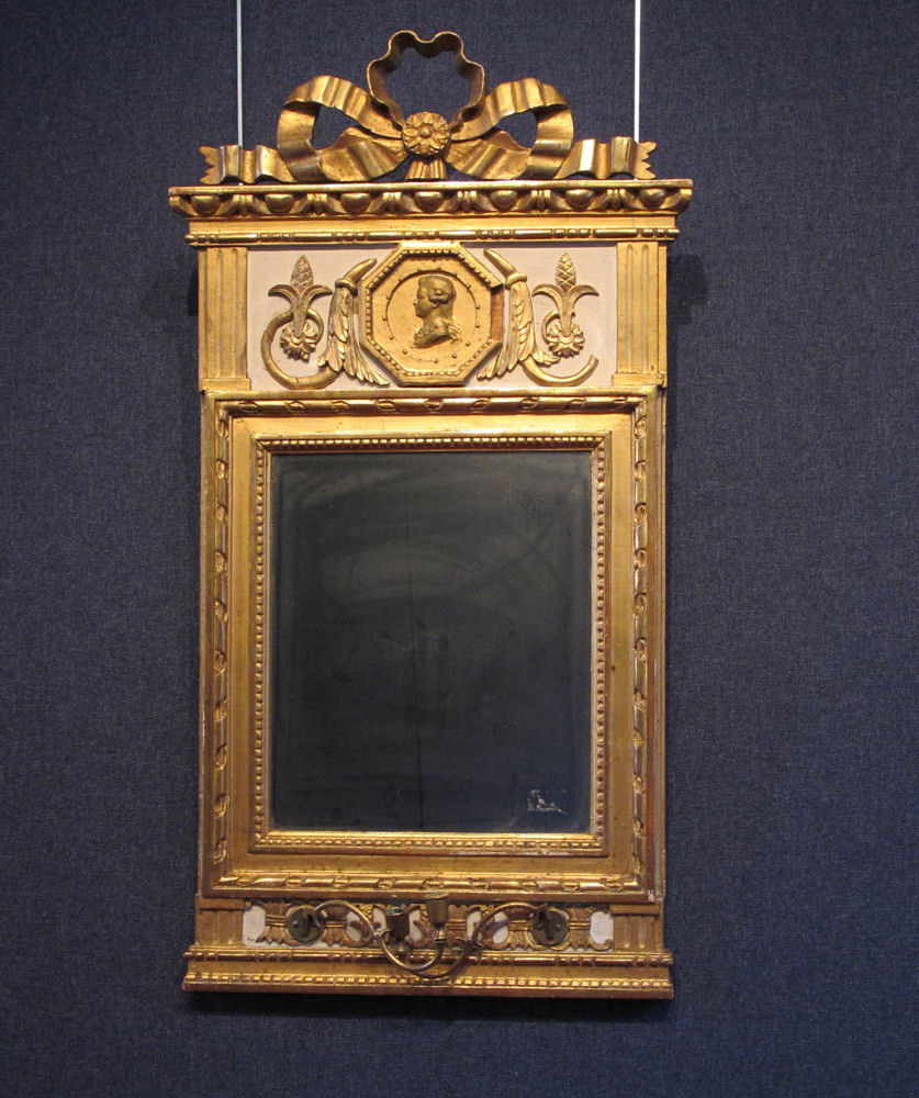 of tall rectangular form, surmounted with a ribbon above a portrait frieze, the base with two scrolled candle branches
