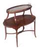 with two graduated oval tiers inlaid with musical instruments and scrolling foliate motifs, raised on tapering square legs with splayed feet, united by stretchers