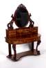 the oval mirror on scroll carved supports, over two banks of short drawers, moulded top, single frieze drawer, raised on cabriole legs terminating in scroll feet united by concave shelves on ceramic castors