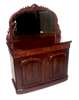 the arched floral carved frame enclosing the mirror plate over a rounded rectangular top, concealed frieze drawer, two arched panelled doors raised on plinth base