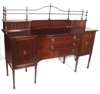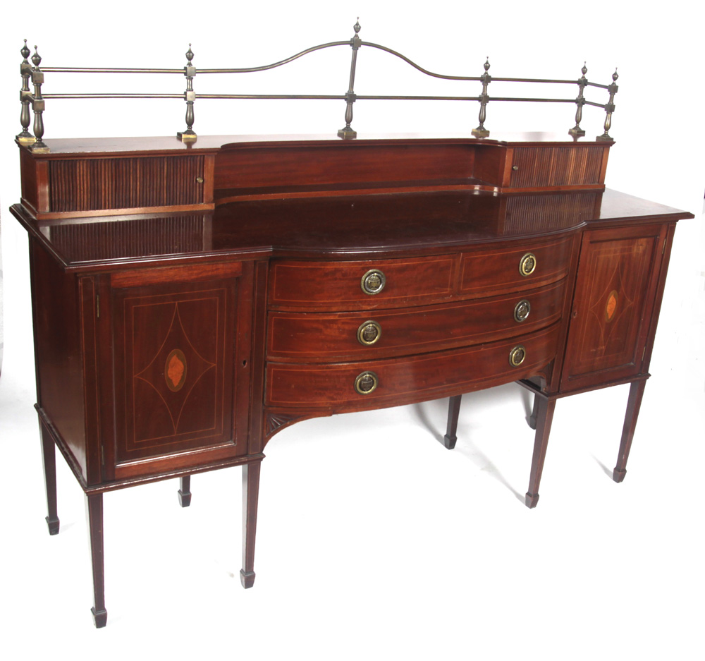the brass rail with urn finials, over gallery with open shelves flanked by tambour compartments, the moulded top over two boxwood strung long drawers flanked by shell inlaid paneled cupboards raised on square tapering legs terminating in spade feet