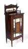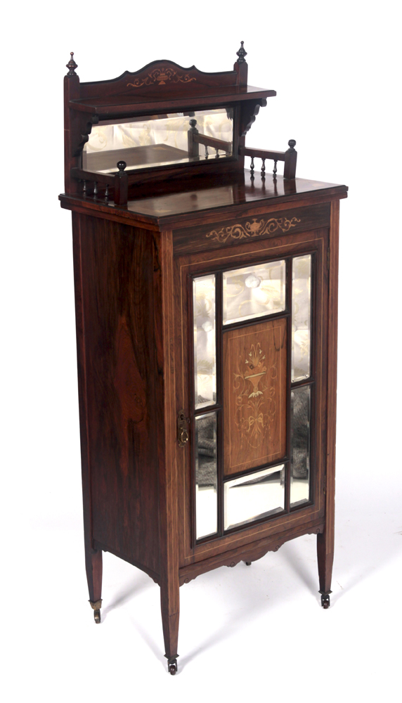 the arched pediment flanked by finials, over a mirrored back, rectangular top, frieze panel, mirrored panelled door, raised on square tapering legs terminating in castors