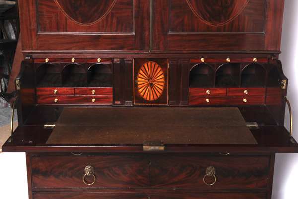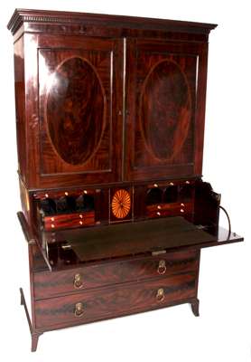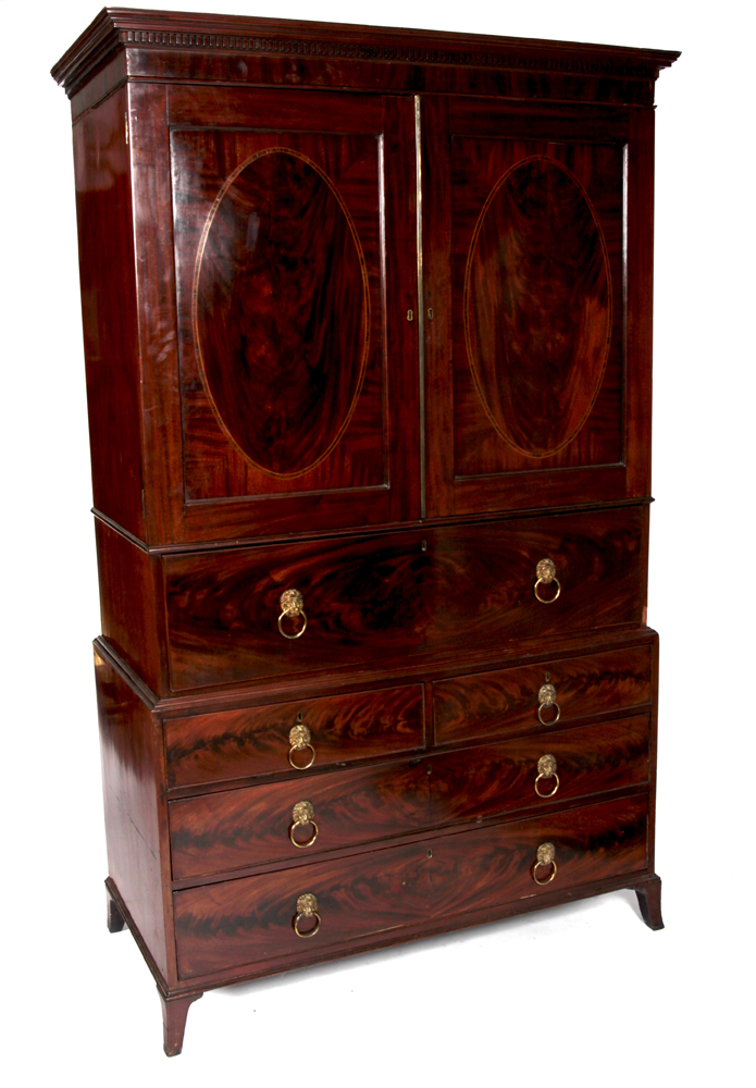 the projected moulded dentil cornice, over flame mahogany oval inlaid doors enclosing slides, deep frieze drawer, enclosing fitted interior, two short over two graduated long drawers, raised on splayed bracket feet
