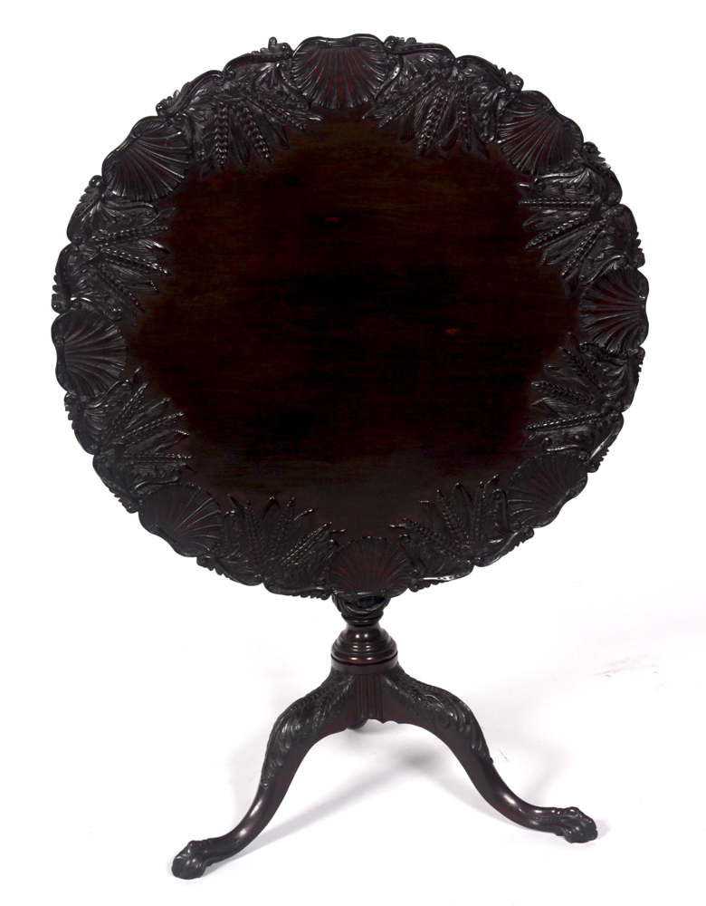 the scallop shell and barley carved circular top, raised on fluted tapering turned column and acanthus carved cabriole legs terminating in claw and ball feet