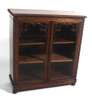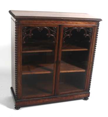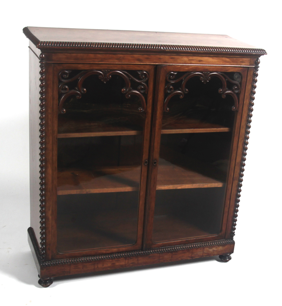 the gadrooned rectangular top over two glass doors with foliate scroll fretwork, enclosing adjustable shelves, flanked by spiraly turned columns, plinth base raised on bun feet