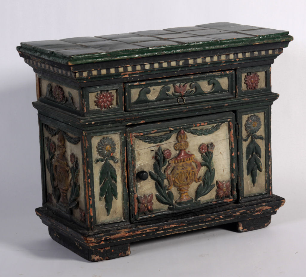 the projected moulded cornice over a frieze drawer, urn carved cabinet door, moulded base, raised on block legs