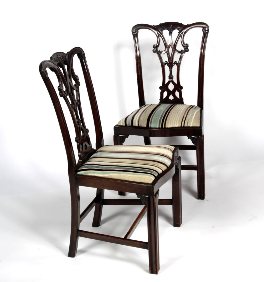 each with acanthus carved serpentine top-rail over pierced interlaced vase shaped vertical splat, serpentine drop-in pad seat raised on moulded square legs united by stretchers (6)
