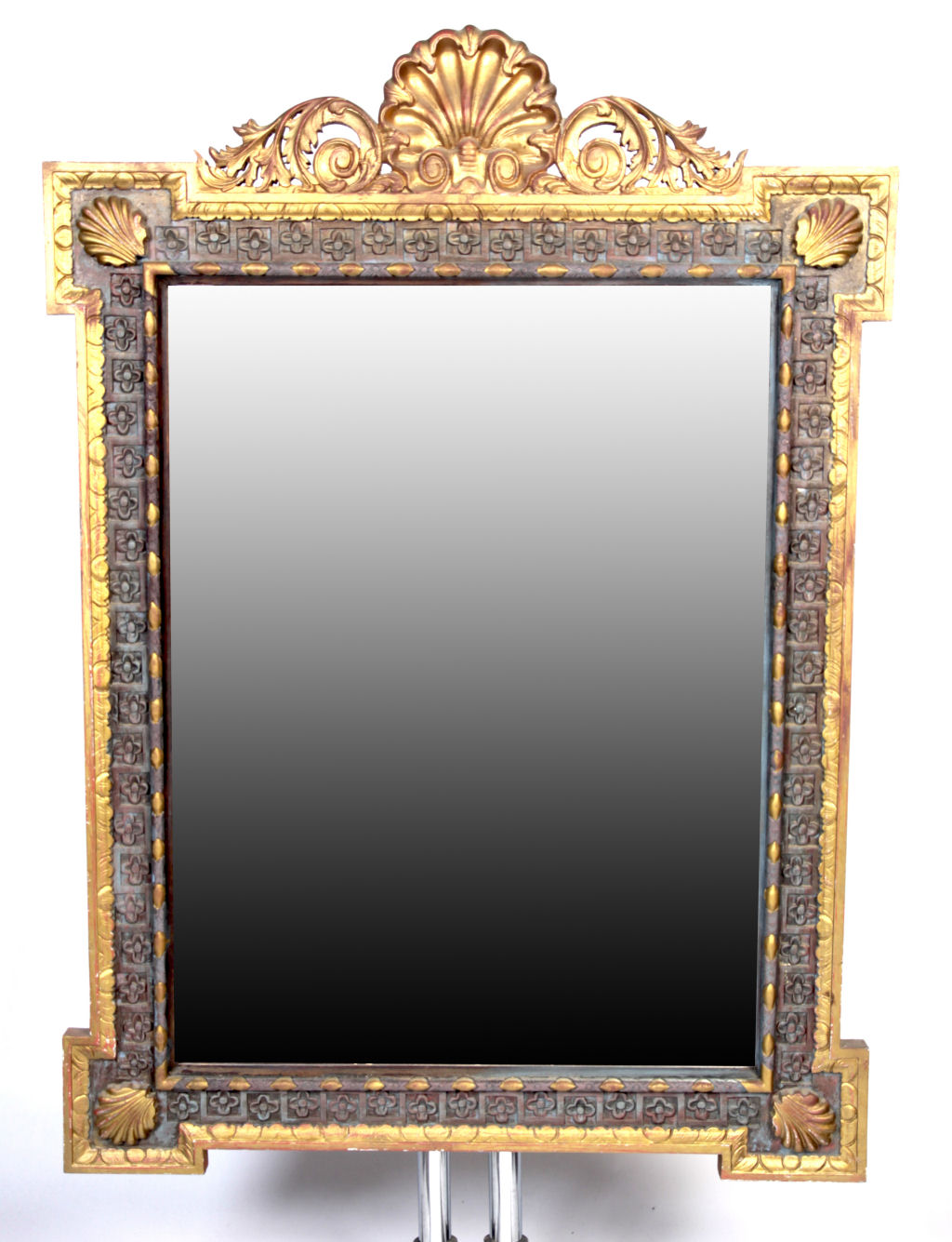 the shell pediment flanked by foliate scrolling, the floral rectangular frame with scalloped corners