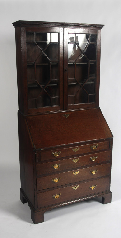the projected moulded dentil cornice over astragal glazed doors, enclosing shelves, moulded fall flap, enclosing fitted interior, over four graduated long drawers, raised on bracket feet