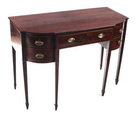 the breakfront top, with moulded edge, central drawer flanked to each side by two shaped drawers, slight box edging, brass loop handles and back plates and raised on square tapering legs, spade feet