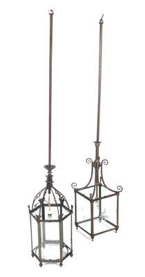 with pierced downswept branches, arrow and foliate cast finials, bevelled glass plates, shaped apron, surmounted by ring turned finials, including a similar square lantern (2)