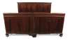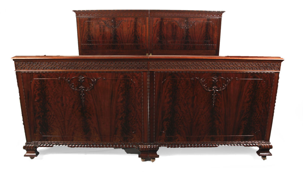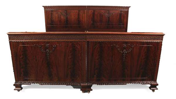 the head board with moulded top over arched fretwork, reeded and foliate panel and similar foot board, raised on gadrooned bracket feet, (formerly a pair of single beds), including bed irons