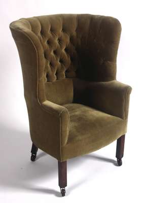 the concave high back over cushioned seat raised on square legs terminating in later castors, the whole upholstered in green velour