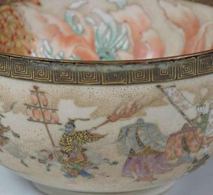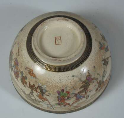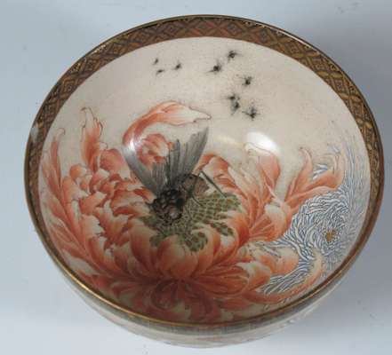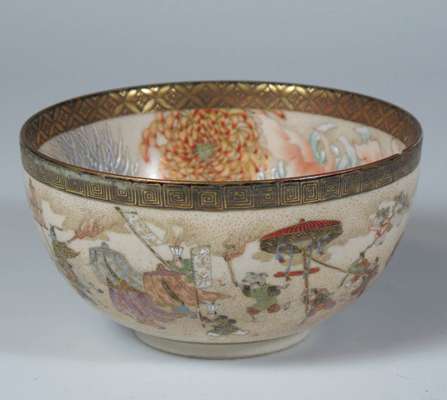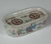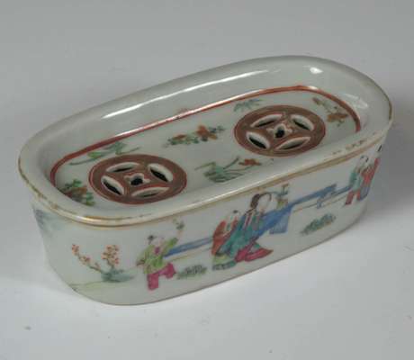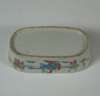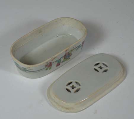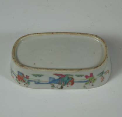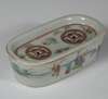 of circular form, the well decorated with chrysanthemums, the exterior with a festival scene, gilt character marks to base, 12cm diameter (chipped); and a Chinese famille rose porcelain container and cover, of oblong form, decorated with figures, 13.5cm wide (2)