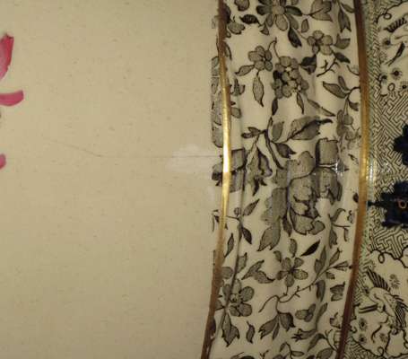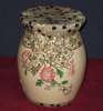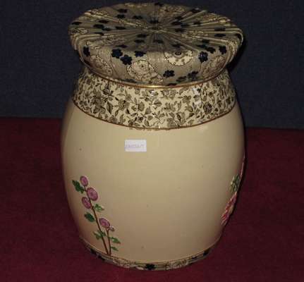 the baluster cream body painted in relief with flowers, with fabric and ribbon moulded transfer printed seat, impressed marks and date mark for 1882 (hairline)