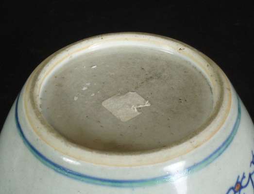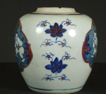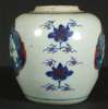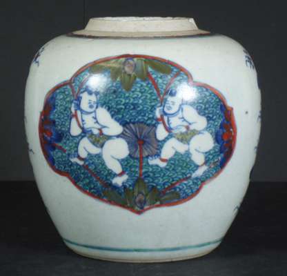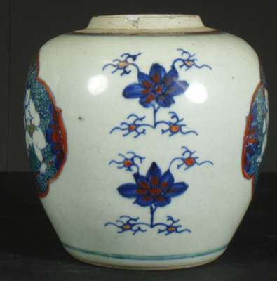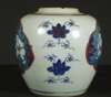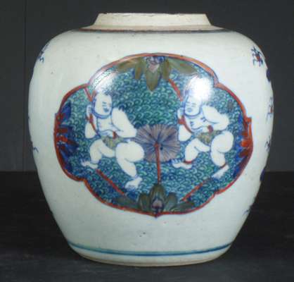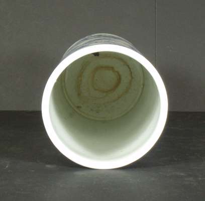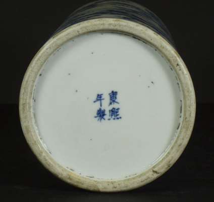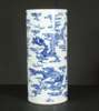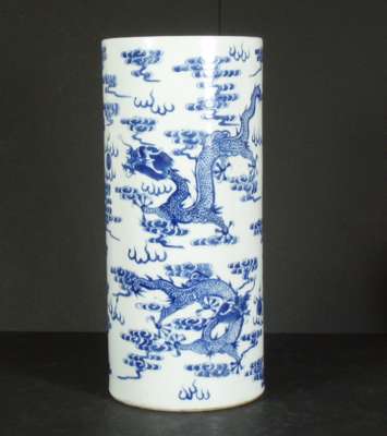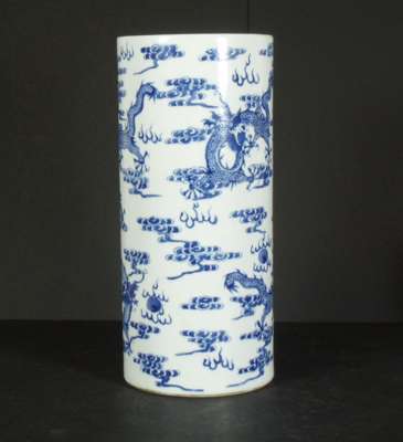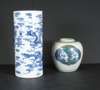 of cylindrical form, decorated with dragons chasing pearls of wisdom amidst clouds, blue character marks to base, 29cm high; and a Chinese blue painted ginger jar with overglaze decoration, 15cm high (2)