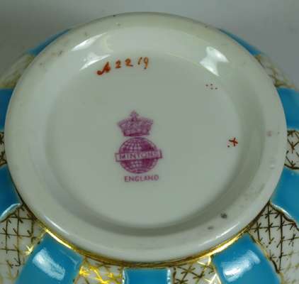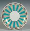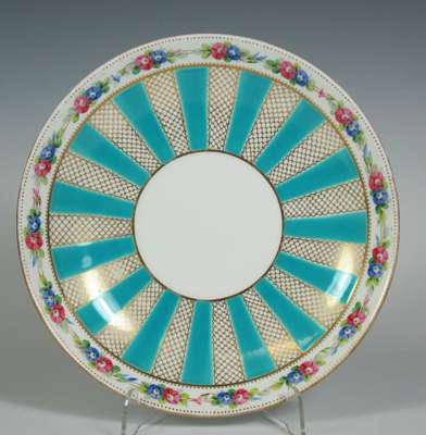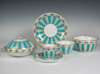 each decorated with turquoise glaze, flower motifs and gilt highlights, comprising: seventeen saucers, twelve cups, two circular plates, a slop bowl, a sugar bowl and a muffin dish and cover (34)