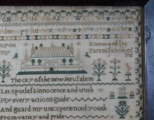 decorated with the city of Jerusalem above a verse inscription and Adam and Eve, contained within a foliate border, 43cm x 33cm; and a small sampler, dated 1834, 20cm x 20cm (2)