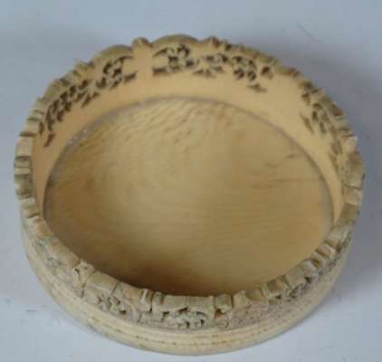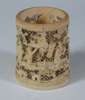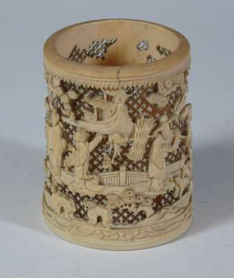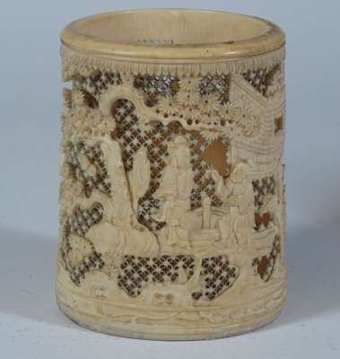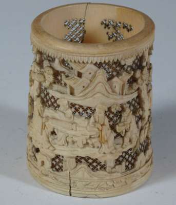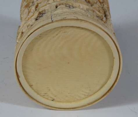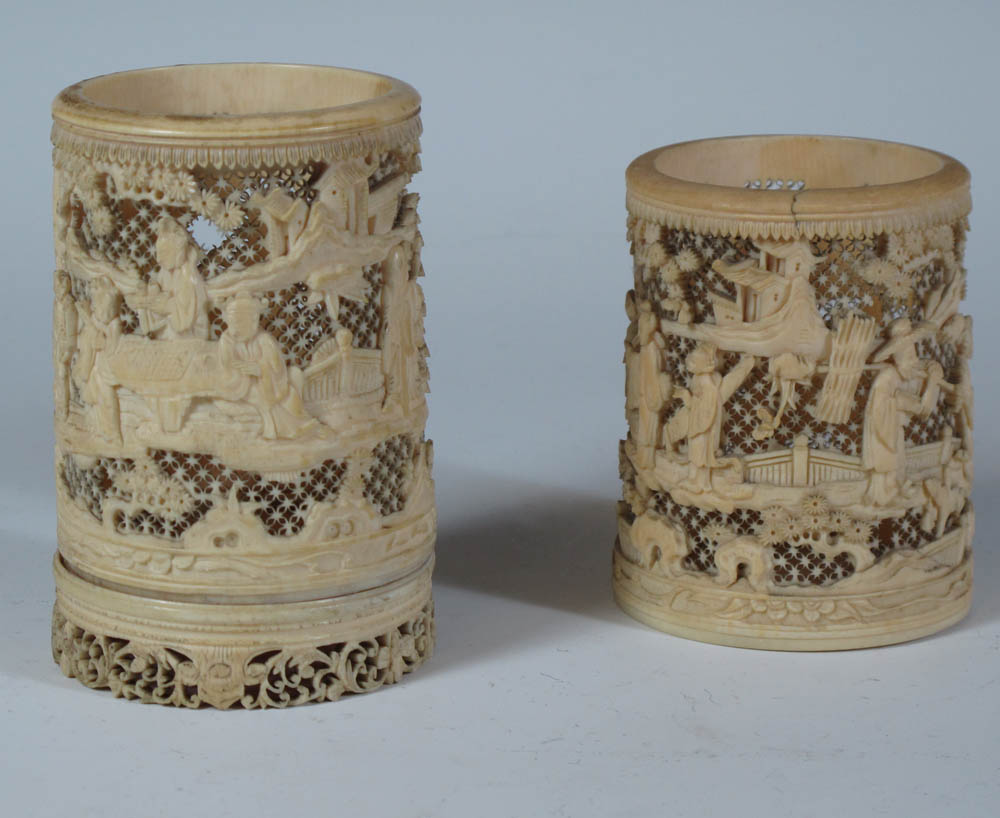 each with carved figures amongst trees, mountains and buildings, one raised on a pierced flower and foliate cast base (2)