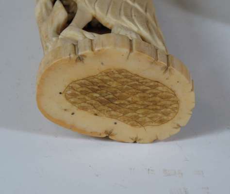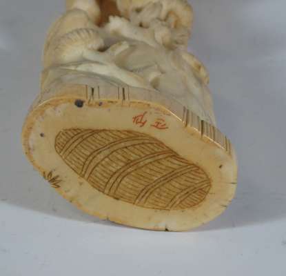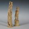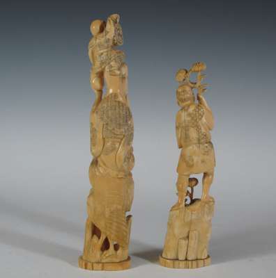 depicting an immortal sitting on a crane, with a fan in one hand and a boy resting on his head with a drum, raised on a scalloped oval base, 30cm high; and another, depicting a man holding a flower beside his head, with further flowers by his feet, raised on a rock, and a scalloped oval base, signed, 25.5cm high (2)