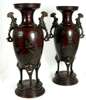 each of baluster form, raised on three legs with mask terminals raised on a stepped circular plinth with grotesque fish handles, relief cast with birds in flight and bold flowers (2)
