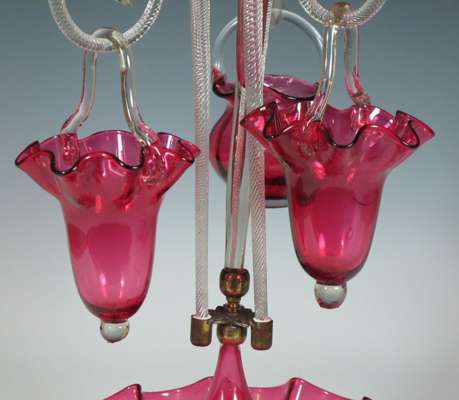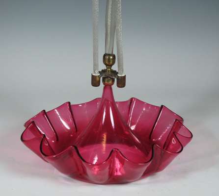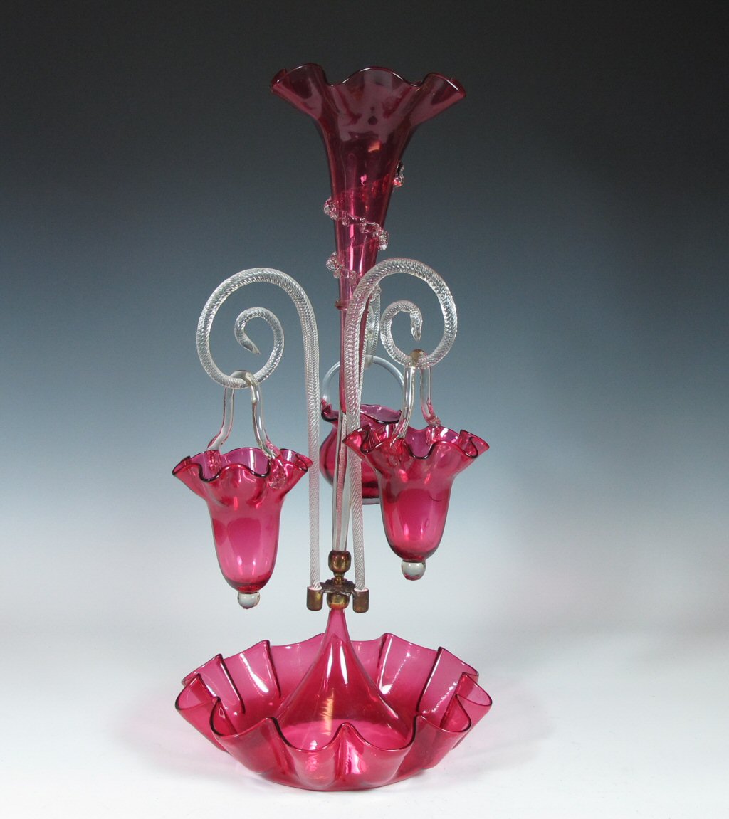 the shaped dish supporting a central trumpet shaped vase, surrounded by three hooks and with three hanging baskets (one basket cracked and one replaced)