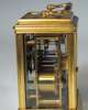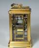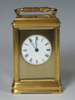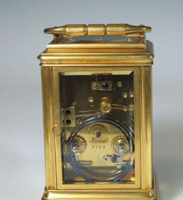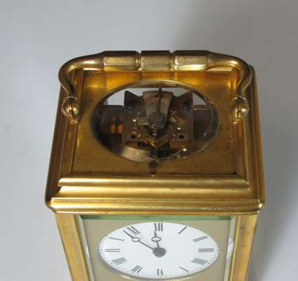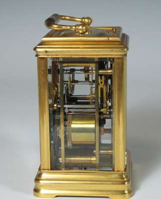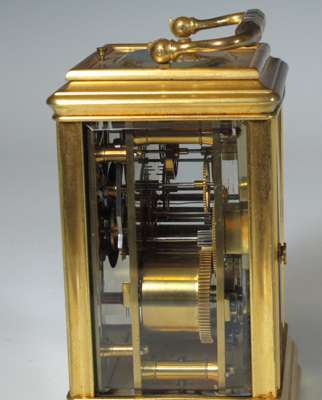 with platform lever escapement, the movement striking the hours on a gong, the circular white dial with black Roman numerals, the gilt metal case with handle
