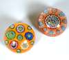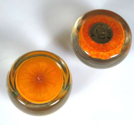 decorated with millefiori canes on an orange ground, Monart label to base, 7cm wide; and a paper weight of similar design, unlabelled, 7cm wide (2)