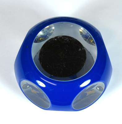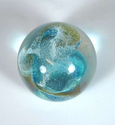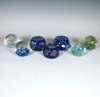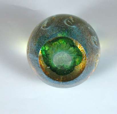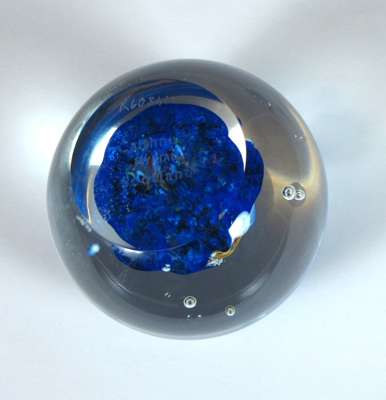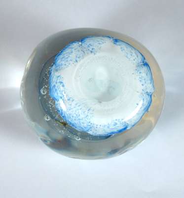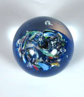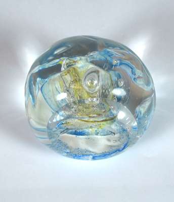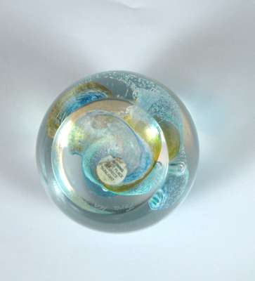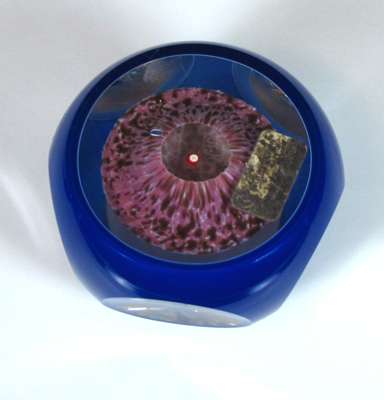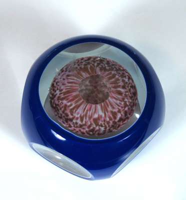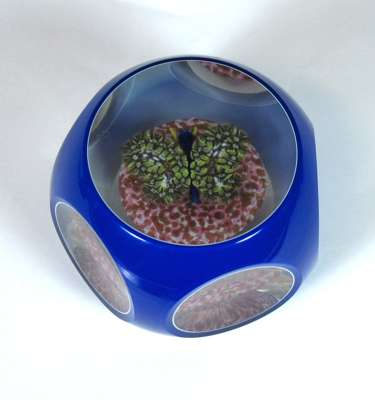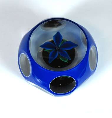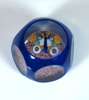 comprising: a Caithness 'Myriad' pattern weight, 7cm wide; a Caithness 'Force Ten' pattern weight, 7cm wide; a Caithness 'Ocean Breeze' weight, 7.5cm wide; a Selkirk 'Christmas 1987' pattern weight, 7.5cm wide; a blue facetted lampwork weight of a green butterfly, 7.5cm wide; a blue facetted lampwork weight of a multi-coloured butterfly, 7.5cm wide; and a blue facetted lampwork weight of a flower, 8cm wide (7)