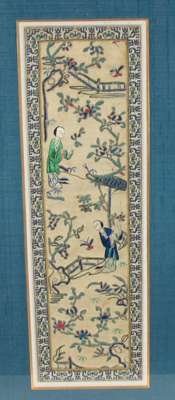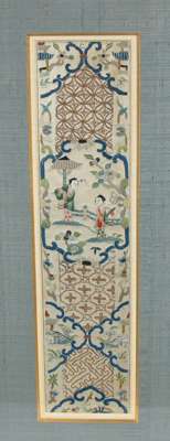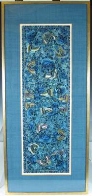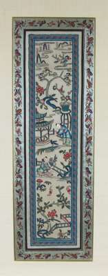 comprising: two panels, each decorated with butterflies on a blue chrysanthemum decorated ground, 66cm x 21cm; a panel decorated with a chinoiserie scene, 57cm x 19cm; and three panels, each decorated with chinoiserie scenes, 38cm high (6)
