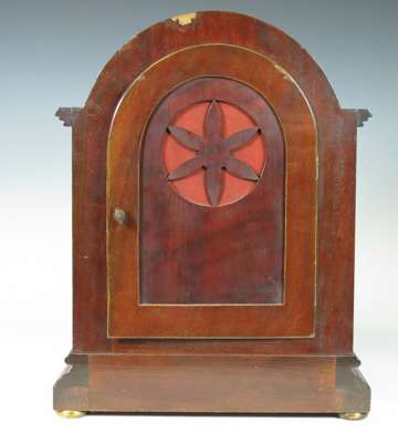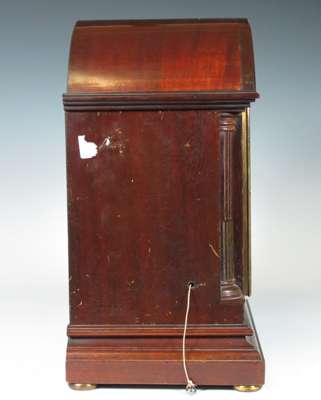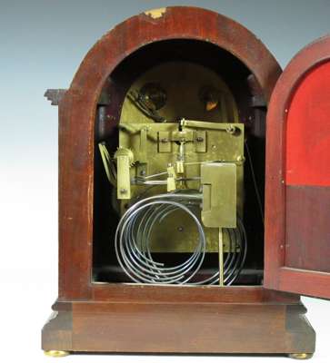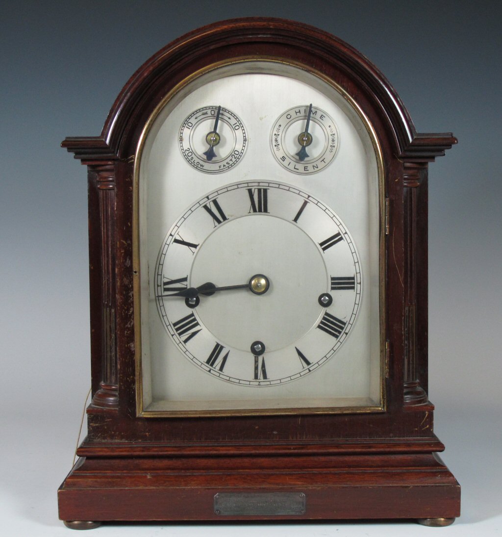 the movement striking on a gong, the arched silvered dial with black Roman numerals, Fast/ Slow subsidiary dial and a Chime/ Silent subsidiary dial