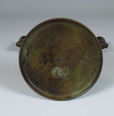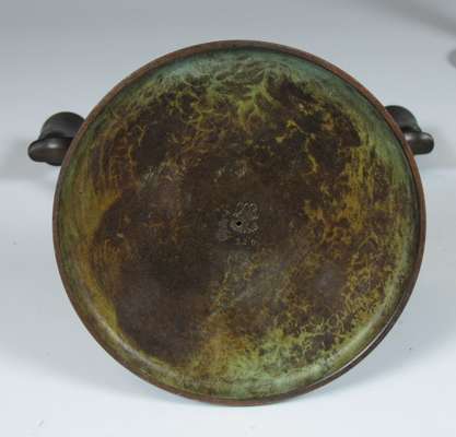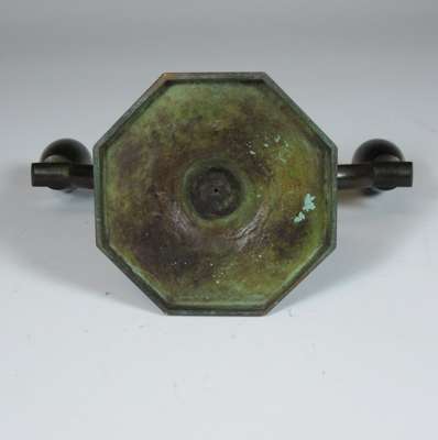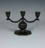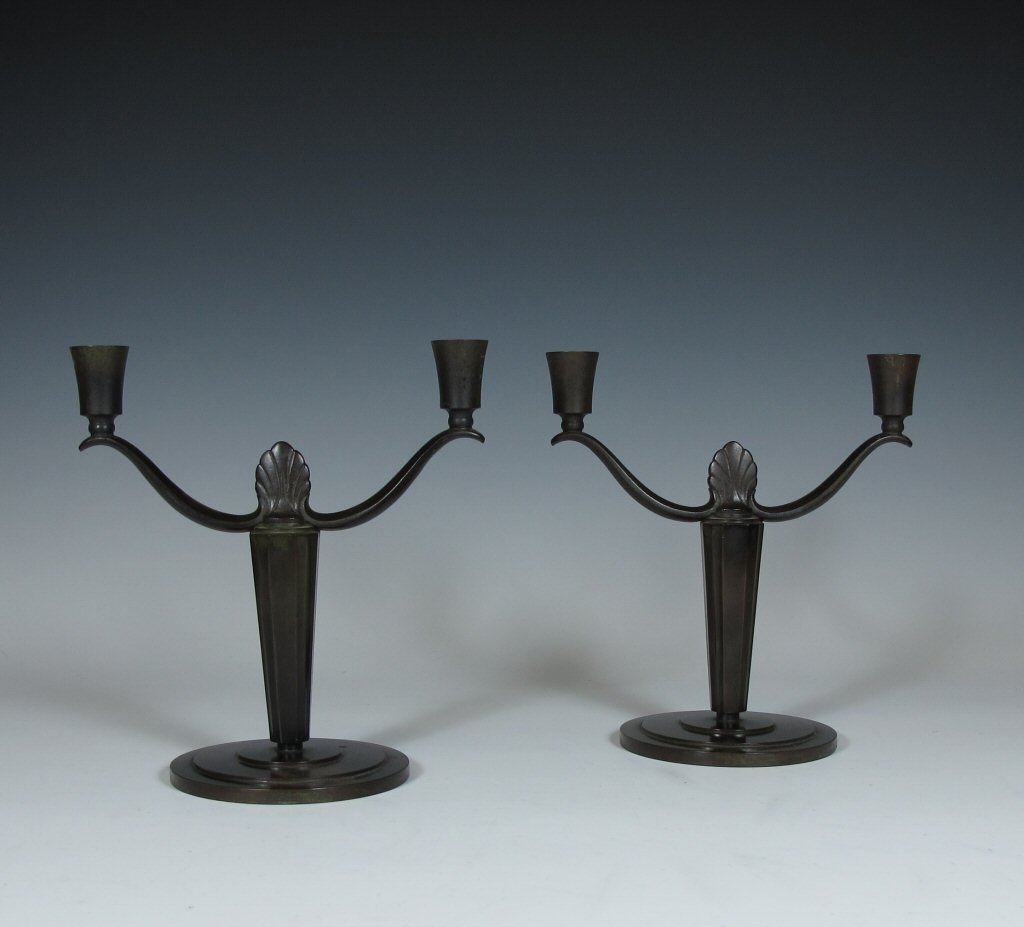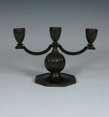 each with double sconces, foliate finial, on circular base, stamped marks, 22cm high; and a Swedish bronze candelabrum with three sconces over a fluted ball column and octagonal foot, stamped marks, 13.5cm high (3)