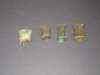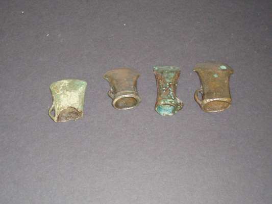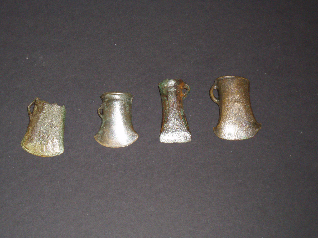 the first with side loop, flared cutting edge, 7.5cm long; a similar example with good patination, 6.5cm long; a similar example with curved cutting edge, 7.5cm long; a damaged example with loss around the opening, 6cm long (4)