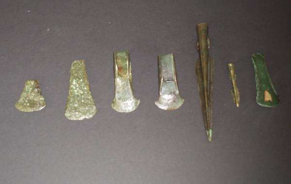 to include a flanged bronze palstave, cast with a pronounced straight stop, flared cutting edge, 9.5cm long; another example with pronounced flanged edges, flared cutting edge, 11cm long; a flat bronze axe, flared cutting edge, 11cm long; a small example with a flared cutting edge, 5.5.cm long; a flanged bronze axehead, 10cm long; a bronze spearhead of leaf shape, with a raised medial rib, flanked by two raised ridges, with two side-loops and a flaring cylindrical socket, 21.5cm long; a small bronze spearhead of leaf shape, with a raised medial rib, two side loops and a flaring cylindrical socket, 8cm long (7)