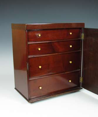 with four drawers, each with turned ivory handles, containing fifteen axe heads of various sizes, thrity-one arrow heads; a Roman oil lamp; and thirty-three fossils and various early stone weights