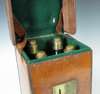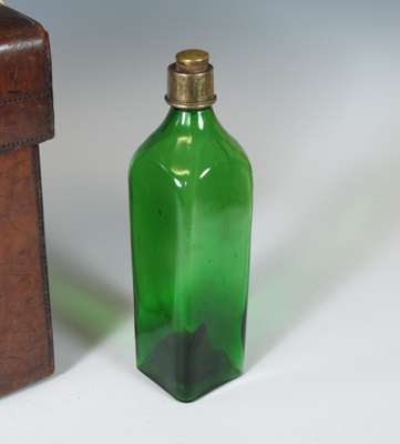 of rectangular form with handle and impressed letter 'C', the interior with four green bottles with silver plated mounts