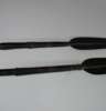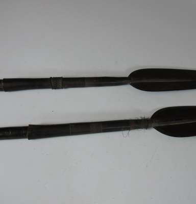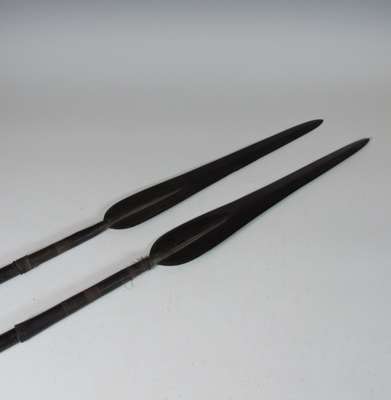 the outer face with panels of Islamic etched decoration with four raised rivet bosses, missing its liner and grips, 46cm diameter; and two African spears, each with elongated leaf blades, original wood hafts, metal tipped, 192cm and 199cm long (3)