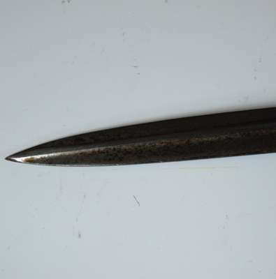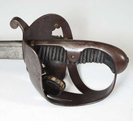 the hilt with brass applied crowned eagle (post 1861), original fish skin grip bound with a double twist of silver wire with single edged pipe backed blade, in original black japanned scabbard