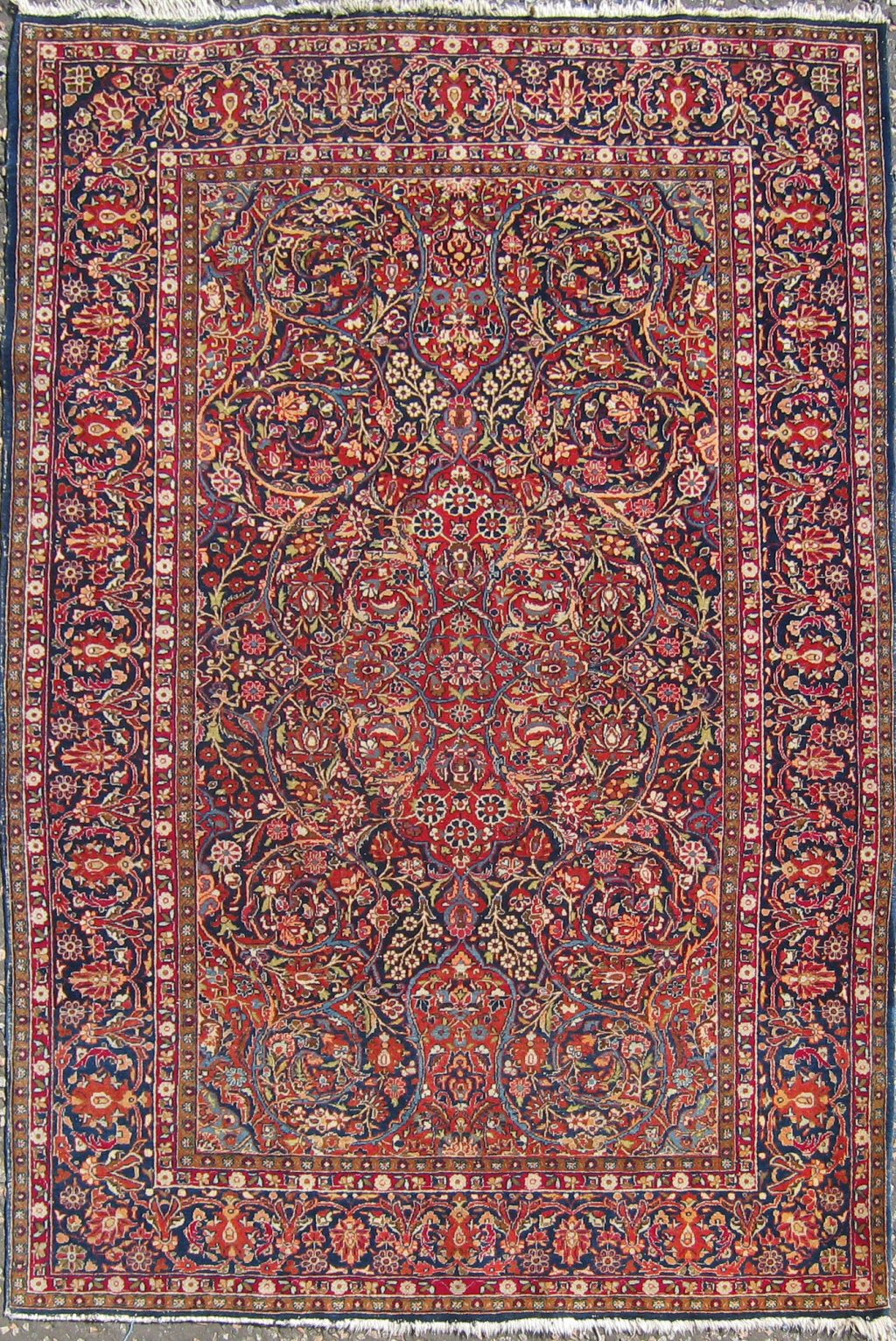 early 20th century, the indigo field with red cusped medallion, red spandrels, within indigo palmette and vine border between bands