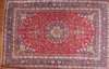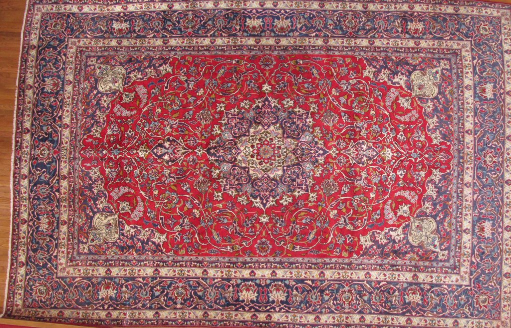 late 20th century, the red field with indigo and cream medallion, similar spandrels, within indigo palmette and arabesque vine border between cream bands