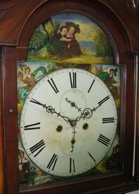 the twin train movement striking on a bell, the painted dial with black Roman numerals and two subsidiary dials, the corners painted with the Seasons, the hood with broken swan neck pediment over columns, the case with panelled doors flanked by pillasters on a plain base with bracket feet