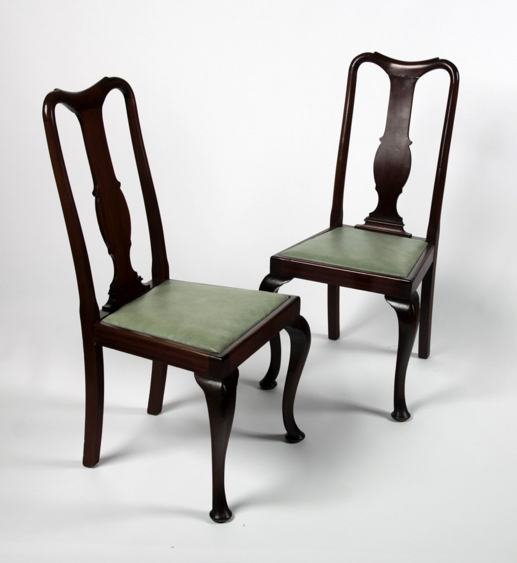 each with shaped top-rail over vertical vase shaped splat, drop-in pad seat raised on cabriole legs terminating in pad feet (6)
